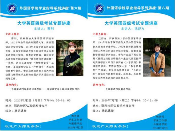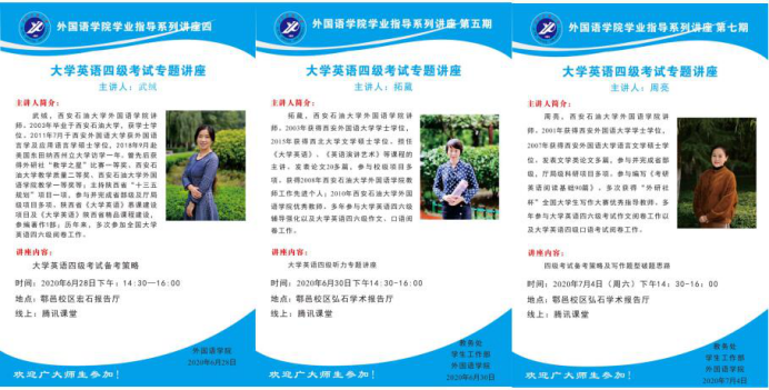 于6月29日至7月7日分别举办五场大学英语四级讲座。此次讲座面向全校学生,以线上和线下两种方式进行,线下主会场设在鄠邑校区弘石学术报告厅,分会场设在各四级强化辅导班教室,线上使用腾讯课堂直播,截至目前为止汗汗漫画