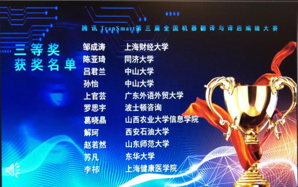 于艳英、李娜老师获得优秀指导教师奖,同时2018级翻译硕士研究生解珂同学获得三等奖的好成绩。
