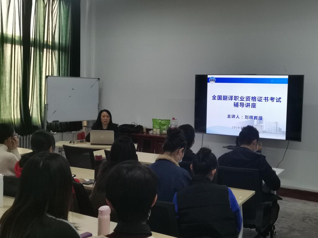 副院长刘辉教授主讲,并请已通过CATTI笔译二级的两名研究生易可、解珂进行了备考经验分享。2018、2019级翻译硕士研究生参加。