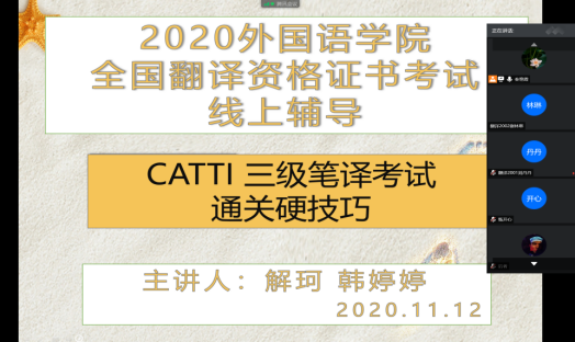 MTI2018级研究生解珂、韩婷婷为学院翻译系和英语系全体本科生线上进行了备考经验分享,她们二人目前均持有CATTI二级笔译证书。