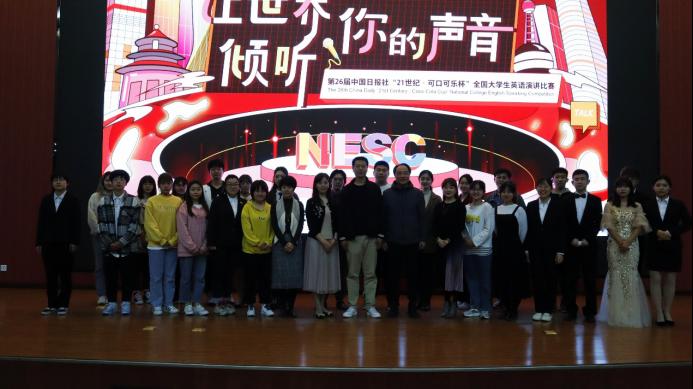 副院长陈武、英语系主任钟泽波、学工办主任张帆、大学外语第一教学部刘西娟和公共外语教学二部毕莹老师担任评委,全校200余名学生参加。
