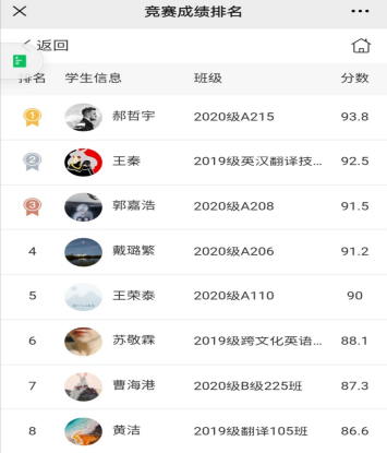 此次大赛全程采用线上竞赛模式,设置多种词汇题型,随机出题,竞赛平台综合学生答题分数和答题时间进行排名。本次参赛学生以2019级和2020级学生为主,在线注册6651人,共计6137人参加,5910人完成比赛,参与率为92.27%,完成率为96.30%。校赛成绩排名前200的学生直接晋级省赛,由平台直接推送复赛邀请给晋级学生。按照我院大学英语的教学安排,此次参赛同学记大学英语课外实践分2分。