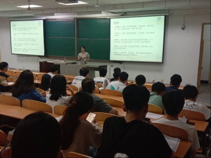 讲座过程中,两位老师结合实例用幽默风趣的话语营造轻松愉悦的气氛,吸引众多同学专心致志地听讲。武绒老师向学生介绍大学英语四级考试中听力部分的考试题型,考试目的以及考试过程中的注意事项,并讲授了听力考试中三种题型的应试技巧。刘西娟老师主要讲授四级作文的写作技巧及考试中写作的注意事项,并对不同类型的真题范文进行深入浅出地分析。