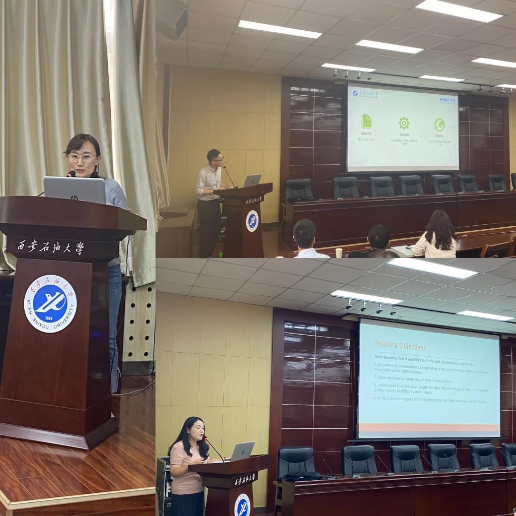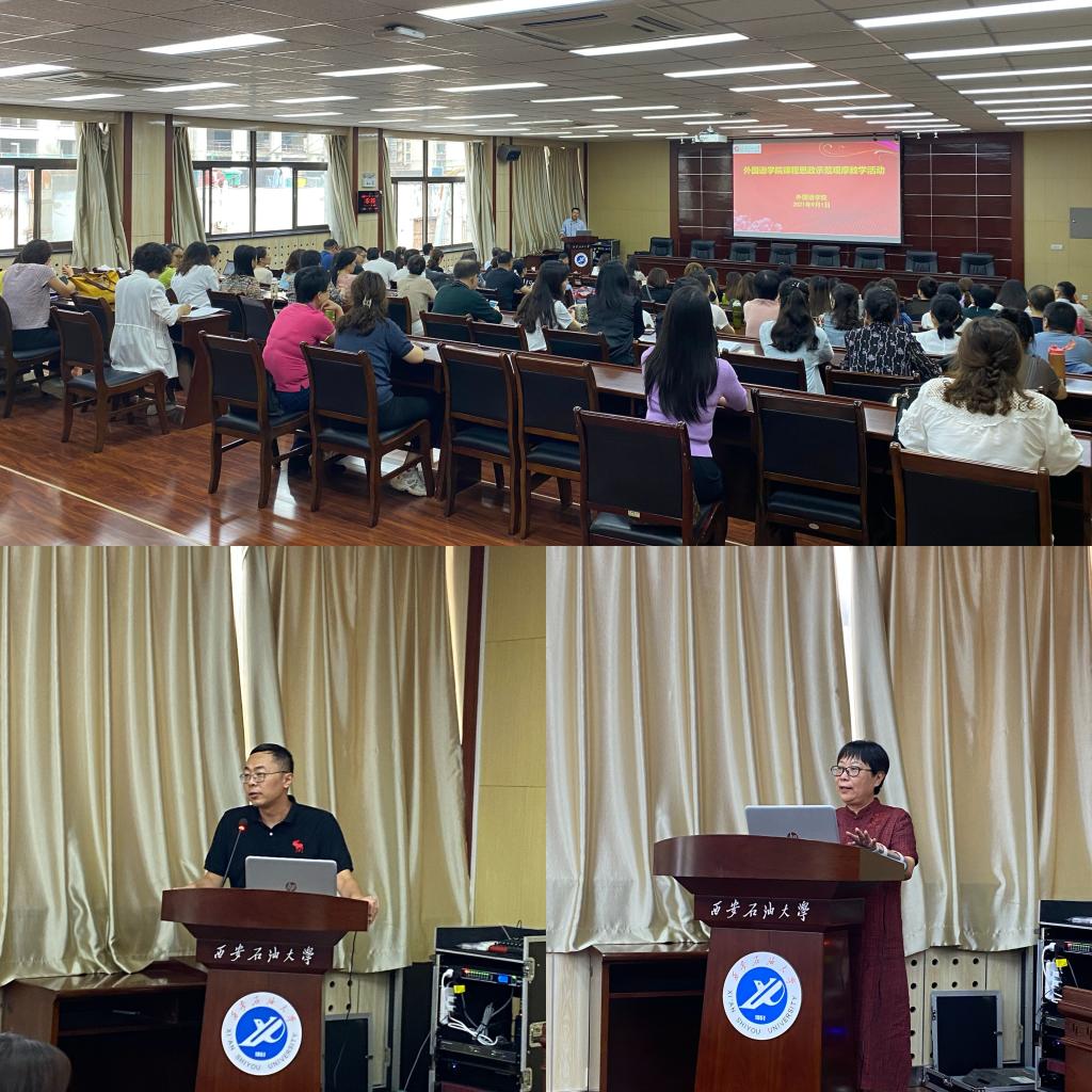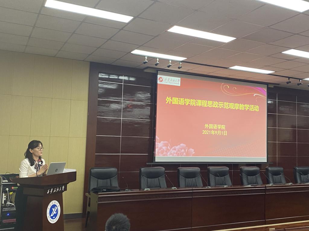 青年教师教学竞赛一等奖的陈旭老师以及在“外教社杯”全国高校外语教学大赛陕西赛区三等奖苗旸老师为大家做课程思政展示,老师们在教学活动中将中外文化相结合,把课程思政融入到外语教学中,引导学生用外语讲述中国故事,用外语传播中国文化。