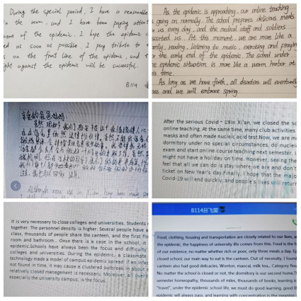 作为一名英语教师,在这个特殊时期,更是以父母般的情怀关注着学生的动向。从2022年元月1日起每天,我会耐心细致地通过微信和QQ等方式提醒大家相信科学,不恐慌、不信谣、不传谣,告知大家每天清扫宿舍垃圾,定期通风,消杀内外环境,让病毒无处藏匿;并通过多种途径向学生转发宣传防控疫情的相关知识和学校官方信息,力争起到积极的引导,运用同理心传递正能量;在班级群里,我提倡让每位学生给家人用英文写一段话,告知在学校一切安好,让父母放心,给自己打气,保持乐观的心态相信眼下的“不自由”是暂时的,相信西安,相信学校,疫情一定可以被控制。在疫情期的这个维度下,“学习”的“学”字我们在课下做了深刻的讨论。很庆幸我的学生中,他们都有一种对这次疫情的自觉,自觉去了解关于这次疫情的新闻,这让我感切感受到这样的孩子才是真正明白“学”字的意义。记得一个学生在大课间问到关于疫情期间还能不能加入学校志愿者可以去帮助他人的问题,让我尊重真正有自己独立思想和乐于奉献的个人。说实话,在过去的教学过程中,我也没有意识到“学”字的意义深远,通过这次疫情期间的线上教学,我发现学习这件事儿是无论时空、对象和场合的,学生同样值得我们敬佩。