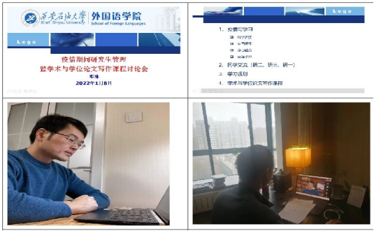 研究生导师们通过“腾讯会议”方式与学生进行线上交流,传达学校近期疫情防控要求以及研究生线上教学的工作部署,了解研究生线上教学存在的问题,及时跟踪2021级研究生课程学习、2020级研究生翻译实践任务、2019级研究生学术论文与学位论文撰写情况,加强对研究生文献阅读、学术研究和论文写作等方面的在线指导。同时叮嘱同学们在疫情防控期间一定要牢固树立安全责任意识,认真做好个人防护,遵守学校疫情防控各项规定,加强锻炼,强健体魄、砥砺意志,保持宿舍的整洁,营造舒适、温暖的学习生活环境。