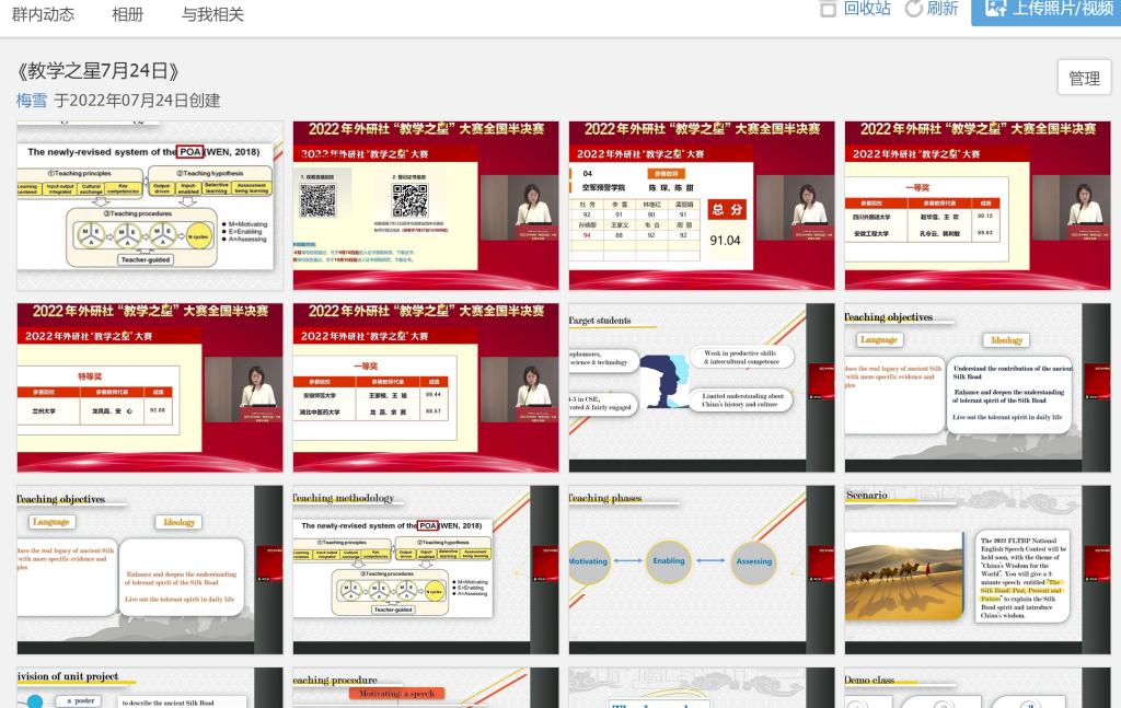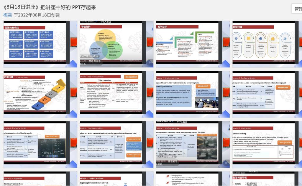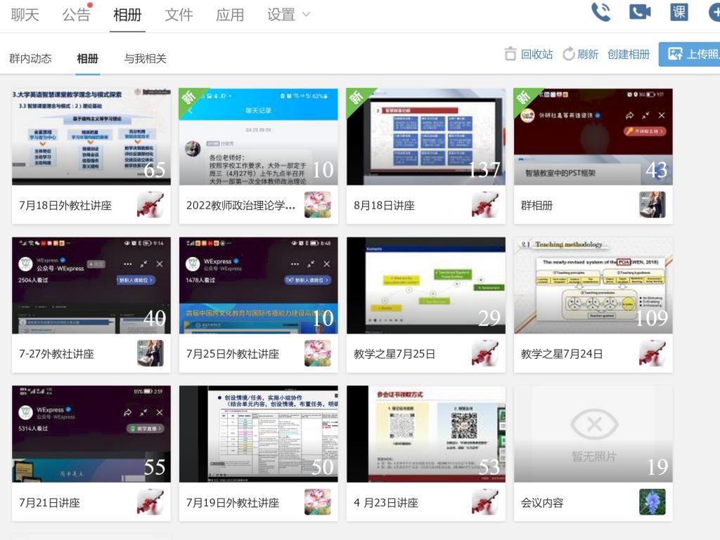 大学外语教学一部根据教学部所承担的教学任务特点,教师个人发展需求,以及院校特色选取了研修班和论坛日程安排中部分讲座作为必修内容,如“高质量发展背景下一流课程建设理念与实施路径”、“智慧赋能:打造WE外语教育的共同未来”、“文明互鉴:高校外语教师中外人文素养提升”、“外语课程思政的纵深推进:人才培养的目标、理念与路径”、“学科智慧教室环境下的新型课堂教学模式创新与实践云专题”等,要求全体教师认真学习,互相交流学习心得,并在教学部工作群中建立了相应的讲座资料群相册,留存讲座重要内容,以供后期查阅学习。同时,大外教学一部也鼓励教师们根据自己的教研兴趣选修研修班和论坛日程中其它讲座内容。