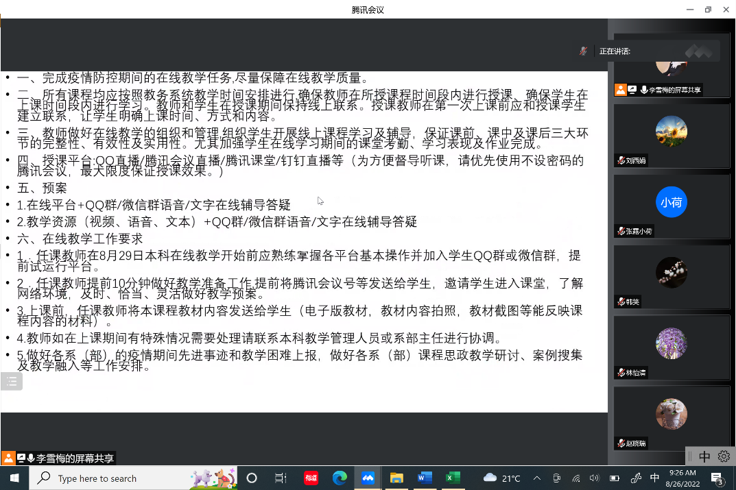 接下来,李雪梅主任对新学期教学工作进行了安排部署,带领一部教师学习西石大[2022]5号文件,向大家传达了学校学院疫情防控精神,要求每位教师落实疫情防控政治责任,遵守学校疫情防控管理规定,认真开展开学线上教学,落实好每一位老师的每一堂课,确保教学质量,加强思想政治教育,及时掌握学生思想动态,确保师生健康安全、学校和谐稳定。