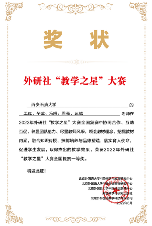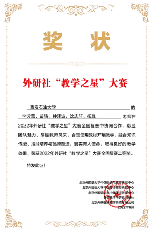 教师王红、毕莹、冯娟、周亮、武绒组成的大学英语教学团队获全国复赛一等奖;李芳蕾、苗旸、钟泽波、沈志轩、拓葳的英语专业教学团队获全国复赛二等奖。