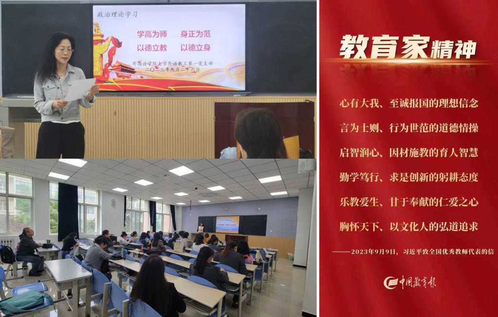 在政治理论学习扩大会上,付俊芳领学了习近平总书记教师节重要指示精神,她表示,作为新时代的高等教育工作者,我们要深刻理解习近平总书记在2023年9月9日致全国优秀教师代表的信中提出的“心有大我、至诚报国的理想信念,言为士则、行为世范的道德情操,启智润心、因材施教的育人智慧,勤学笃行、求是创新的躬耕态度,乐教爱生、甘于奉献的仁爱之心,胸怀天下、以文化人的弘道追求”教育家精神的科学内涵和内在逻辑,牢记为党育人、为国育才的初心使命,把师德师风建设摆在首要位置,不仅要在教学中为学生传授知识,更要通过自己的言行举止为学生树立正面榜样,以赤诚之心、奉献之心、仁爱之心投身大学英语教育事业。葛丽领学了“学高为师身正为范以德立教以德立身”相关教育内容,她谈到,习近平总书记强调:师德是深厚的知识修养和文化品位的体现。师德需要教育培养,更需要老师自我修养。做一个高尚的人、纯粹的人、脱离了低级趣味的人,应该是每一个老师的不懈追求和行为常态。
