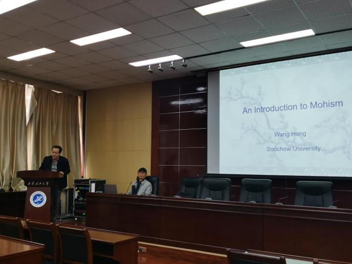 示范课包括墨家学说简介及诗歌翻译两部分。王宏教授首先向大家简要介绍了墨子及其学说,并对墨子的世界观和墨家学说的影响做了简要论述。其次,王宏教授通过具有代表性的翻译案例,向大家讲解了有关诗歌翻译的观点,如诗歌概念,形式和种类,翻译方法,翻译步骤,翻译原则及诗歌翻译中的再创造等。