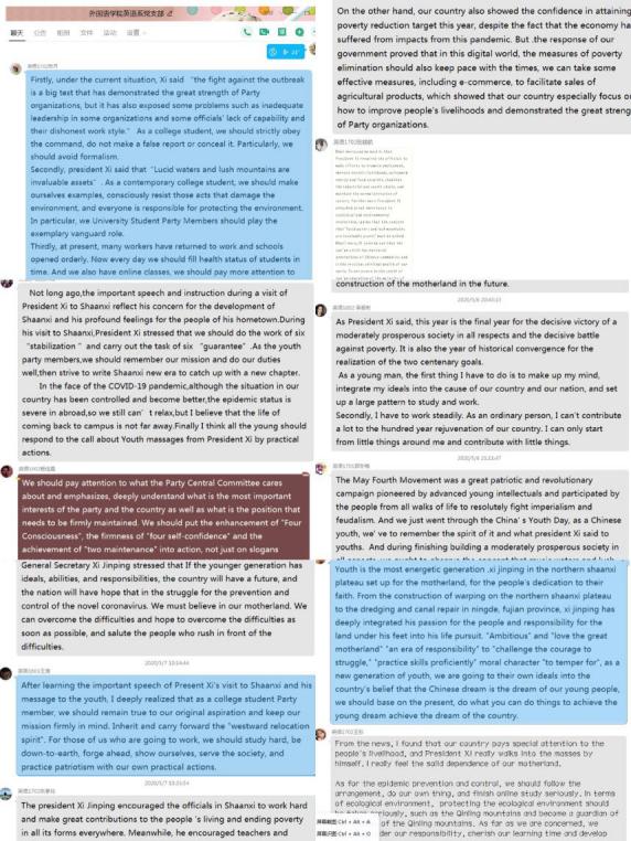 2017级党员齐泽芃说:“President Xi came to Shaanxi province to instruct officials to overcome the impact of the novel corona virus outbreak and fulfill this year's poverty eradication goal during an inspection tour, actually I have lots of words and feelings after what China and the world have gone through or have been going through until now, I really think we Chinese people are the most disciplined nation in the world, which helped us overcome the epidemic quickly. Compared to other countries, we can see they are still in a complete mess, and many countries turn to China.”
