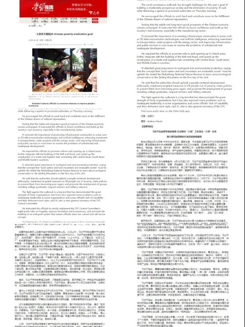 专题学习会上,通过原文学习新华社《习近平在陕西考察时强调 扎实做好“六稳”工作落实“六保”任务 奋力谱写陕西新时代追赶超越新篇章》,认真学习习近平总书记来陕考察重要讲话重要指示精神,深刻学习领会习近平总书记关于新冠肺炎疫情常态化防控工作的重要讲话和指示精神。通过《China Daily》头条播报中《Xi stresses poverty eradication goal》一文和习近平总书记五四青年节对广大青年的寄语双语学习资料内容进行重点学习,张帆老师还对习近平总书记来陕视察讲话重要指示精神中的重点部分进行中英对照讲解。