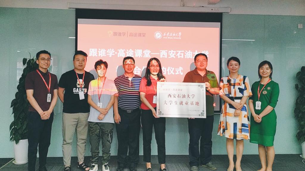 6月4日,外国语学院联合经济管理学院、人文学院共赴跟谁学•高途课堂西安分公司开展大学生就业市场回访,并分别签订了学院大学生就业基地协议书。西安高途云集团中心西安公司总监何志欣,人力资源部经理刘菲与学校经济管理学院党委副书记赵海涛、人文学院党委副书记盛丹和学院党委副书记王业青参加了大学生就业基地签约仪式。