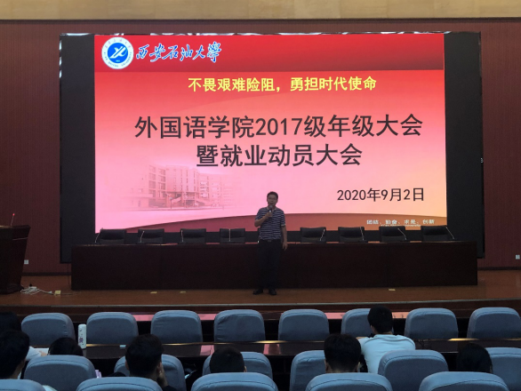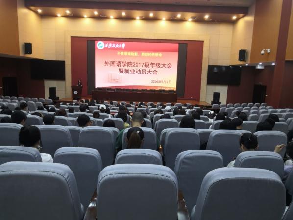 党委副书记王业青、2017级辅导员陶李在鄠邑校区图书馆弘石报告厅召开了2017级年级大会暨就业动员大会。