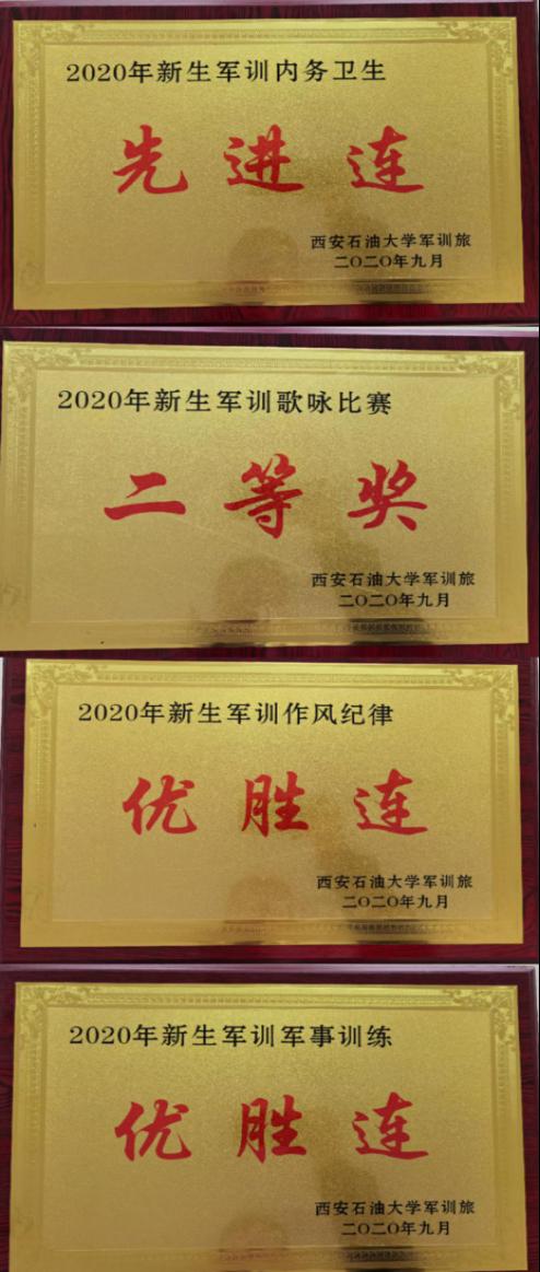 分别获得了“2020年新生军训内务卫生先进连”、“2020年新生军训歌咏比赛二等奖”、“2020年新生军训作风纪律优胜连”、“2020年新生军训军事训练优胜连”称号,2020级辅导员陈浩被评为“优秀连指导员”。