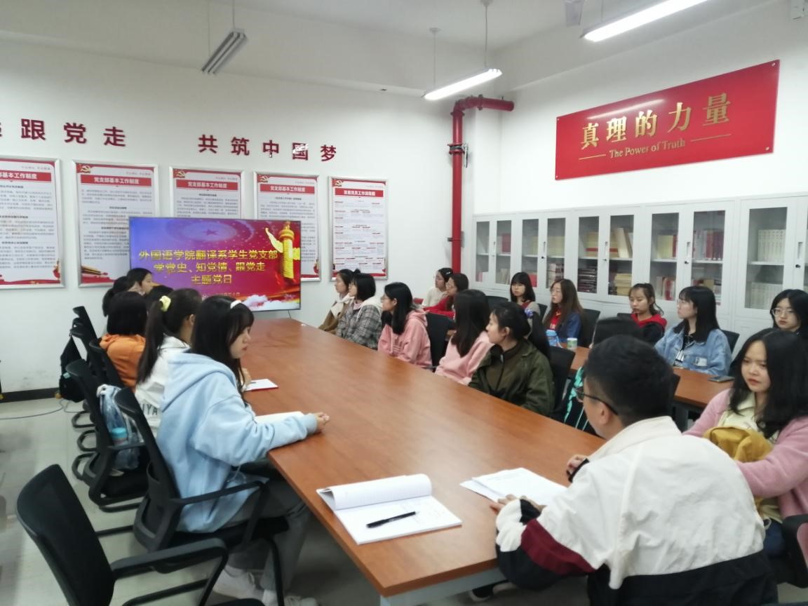 百年征程波澜壮阔,百年初心历久弥坚。2021年是中国共产党成立100周年,为切实增强当代青年学生党员的历史使命感与责任感,始终坚定不移听党话、跟党走。3月30日晚上,翻译系学生党支部在鄠邑校区院系楼430开展翻译系学生党支部学党史、知党情、跟党走支部学习。由翻译系学生党支部书记陈浩主持。