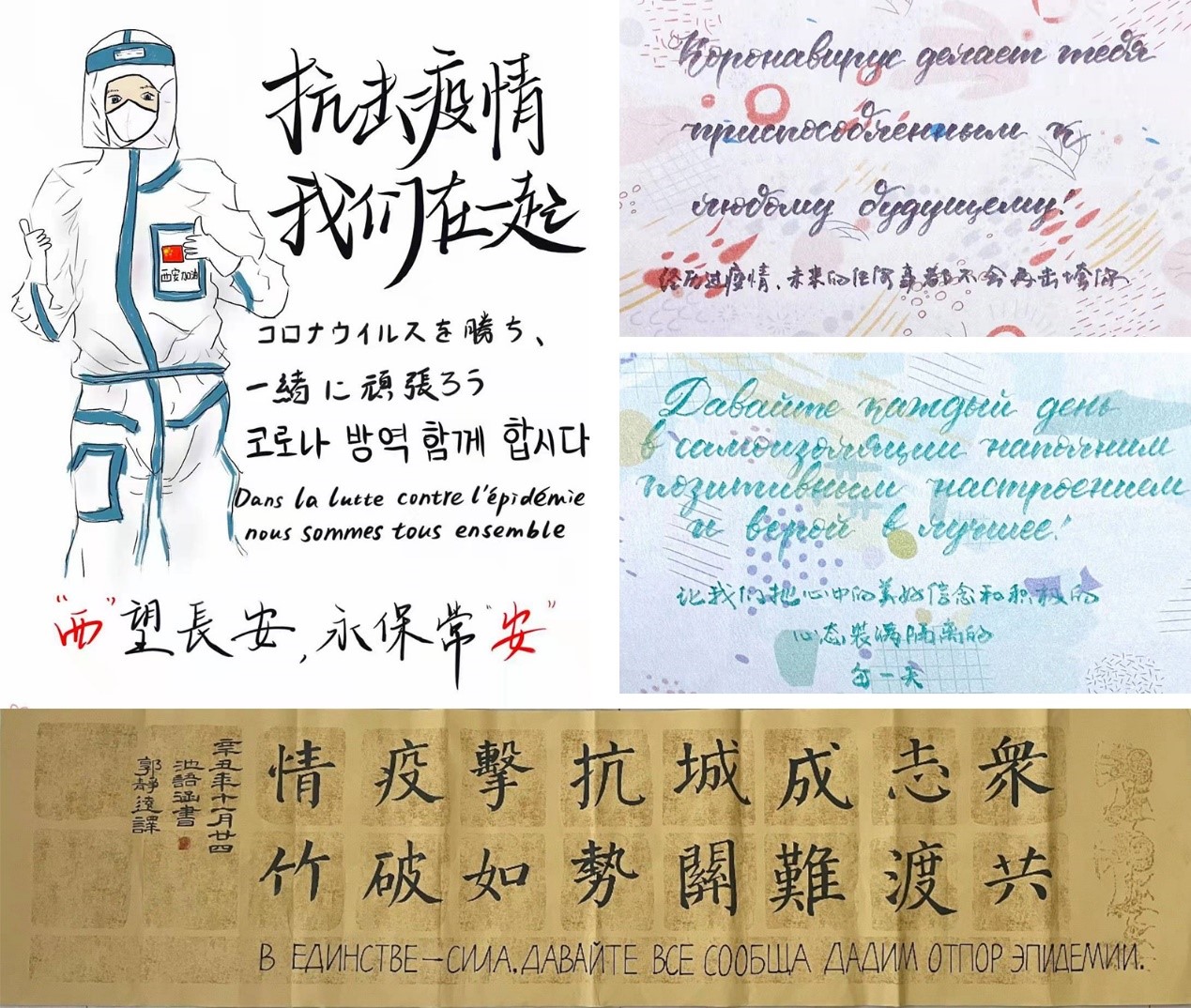 面对这场没有硝烟的战争,学院积极引导学生充分发挥专业优势和个人特长,将习近平总书记“营造万众一心阻击疫情的舆论氛围,凝聚起众志成城、共克时艰的强大正能量”的重要指示落到实处。用俄语、法语、西班牙语、韩语、日语……等多语种录制抗疫宣传视频,为战疫加油,为西安加油。并鼓励大家发挥个人特长,用笔墨鼓舞抗疫斗志、礼赞抗疫英雄,传递“西石大温度”。