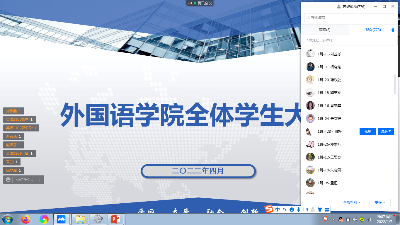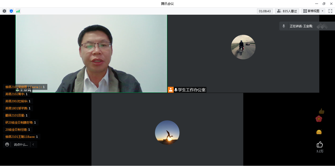 为进一步落实疫情防控工作要求,加强学院思想政治教育,推进学院班级建设工作。4月7日晚通过召开了线上全院学生会议。院党委副书记王业青,辅导员老师,全体研究生、本科生参加会议。会议由院学生工作办公室主任周宇主持。