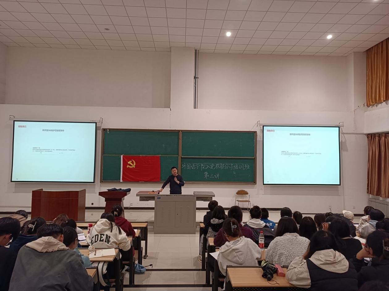 在鄠邑校区石工地科楼115教室举行第十一期入党积极分子培训班第三次集中授课。校团委书记何国强为2022年入党积极分子授课。