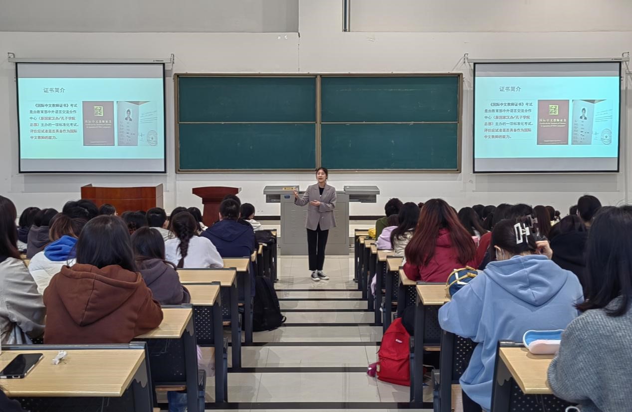 为进一步做好学生职业规划,促进毕业生高质量就业。3月30日学院在石工地科楼115举办汉语教师志愿者国家公派项目政策宣讲会。邀请陕西省汉语国际教育研究会副秘书长、《国际中文教师证书》西安外国语大学认证中心考务负责人张青作专题宣讲。副书记王业青主持,辅导员陈浩及2019级、2020级本科生和2022级研究生共计200余人参加了此次宣讲会。