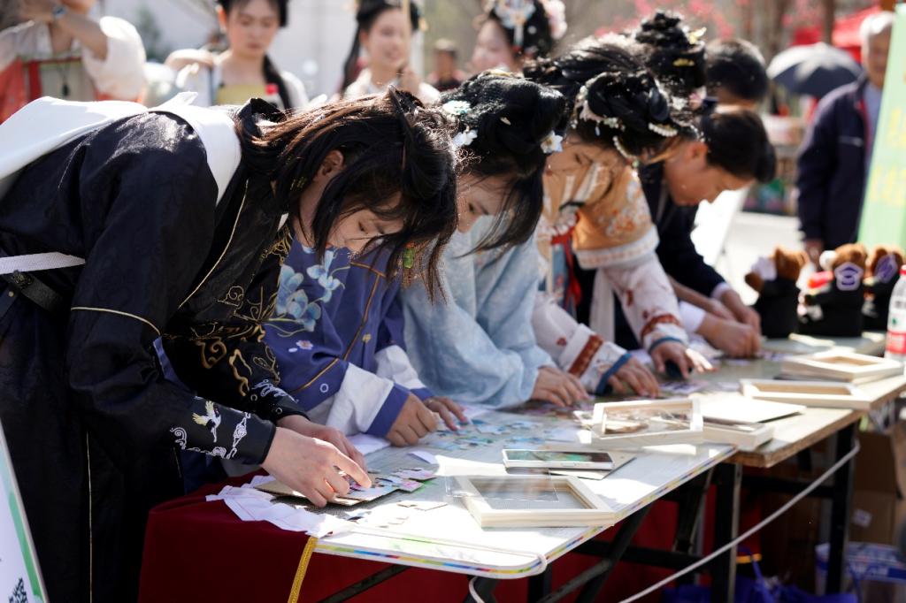 学生加油鼓劲。“拼图学法”环节将普法知识与电视剧《甄嬛传》的情节相集合,提出问题,现场问答。上一轮回答错误后默默学习民法典的同学终于在这一轮中取得胜利,同学们齐心协力进行法治元素拼图,并在规定时间内完成五副由拼图组成的“法治桃花节”图画。“法治诗词对对碰”将5个中国蕴含法治文化的古诗词上半句给出,学生进行下半句对答,现场学习氛围热烈,学生们能够准确对应下半句,并将诗词进行现场解析。