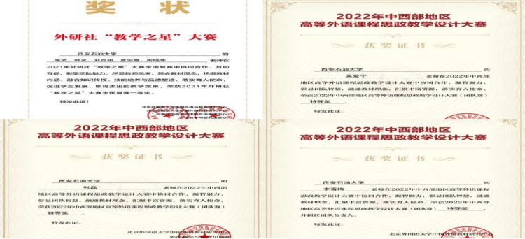 “教学质量奖”,近四年来,4名教师积极进取,在职攻读博士学位;3名教师参与陕西省精品在线开放课程《大学英语》的建设工作;1名教师作为主要参与人参与1门省级线上线下混合式一流课程和1门第三批国家一流本科课程拟推荐线上课程的建设工作;6名教师获得外研社“教学之星”大赛一等奖;5名教师获得全国高校外语课程思政教学案例大赛团队特等奖;1名教师获得全国高校外语课程思政教学案例大赛二等奖,多名教师在学校课程思政“大练兵”、教师教学创新大赛和青年教师教学竞赛中获得可喜奖项。在2019年开设的方向课程《英语电影赏析》立足培育和彰显校园文化,通过课内外电影情景模拟、角色扮演、配音展示、歌曲演唱和期末汇演等多种课堂教学形式,在文化育人创新与实践和教学改革中起到了良好的示范辐射效应,在汗汗漫画