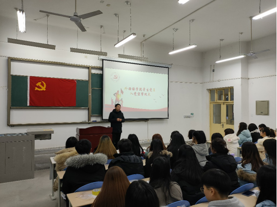 在B区104教室举行新发展预备党员入党宣誓暨党员重温入党誓词活动。学院党委副书记王业青,全体新发展预备党员和部分正式党员参加,仪式由专职组织员岳頔主持。