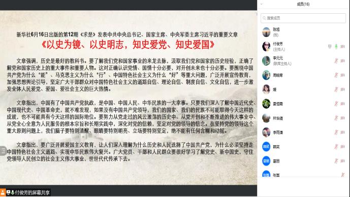 大学外语第一教学部党支部通过腾讯会议在线上举行了“以史明志”学习教育专题研讨会。会上,同志们就专题学习内容进行了深入的沟通和探讨,理论水平和政治觉悟又得到了进一步提升。