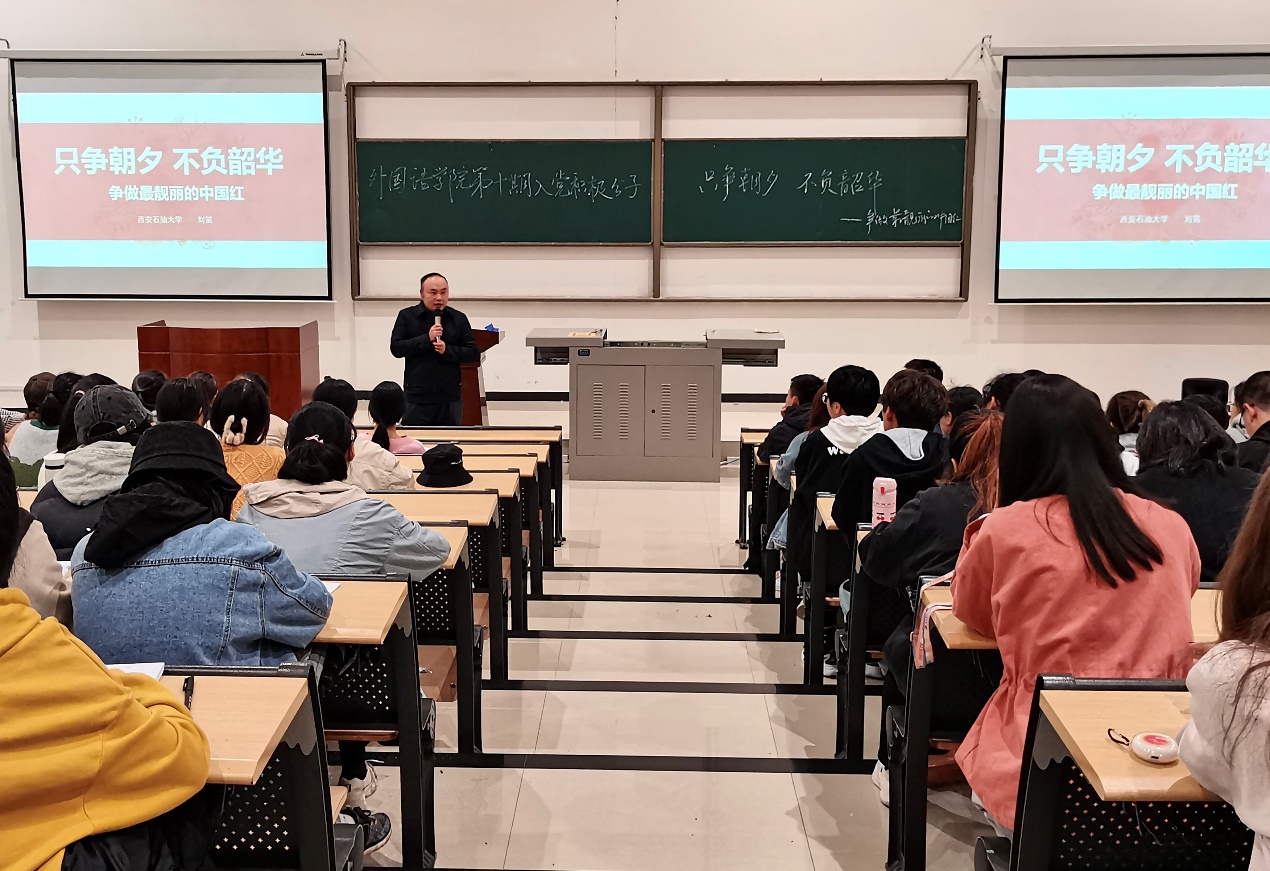 在鄠邑校区石工地科楼115教室举行第10期入党积极分子培训班第三次集中授课,校党委学生工作部副部长刘笛应邀担任主讲。共计200余名入党积极分子学员参加培训。
