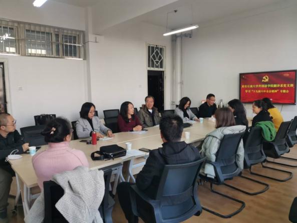 翻译系教工党支部在雁塔校区华油能源楼706会议室召开政治理论与业务学习扩大会。学院党委委员赵玮老师作为支部联系人参加会议,会议由党支部书记高鹏鹏主持。