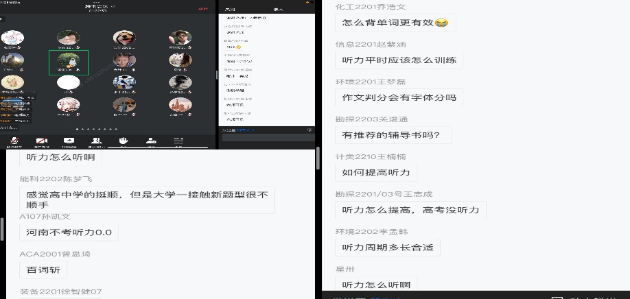 曾思琦、张雯婕、黄云龙、李卓尔和孙嘉5位在大学英语四、六级考试以及各种竞赛中取得优异成绩的同学分享了各类考试、竞赛经验和学习体会,并对同学们提出的问题进行了详细解答。曾思琦通过四个方面的讲述,分享了自己的学习经验和方法。张雯婕从自己的英语学习经历出发,详细地展示了自己是如何有效地学习积累词汇,并对英语竞赛备赛以及大学英语四、六级备考提出了具体的建议。黄云龙讲述了自己的大学英语六级奋战之路,强调了利用好真题、复盘反思和心态的重要性。李卓尔从大学英语四、六级备考、英语竞赛、日常积累和生活中的英语学习四个方面分享自己的经验。孙嘉分享了英语词汇学习和口语练习方法,强调了参加英语竞赛的重要性。