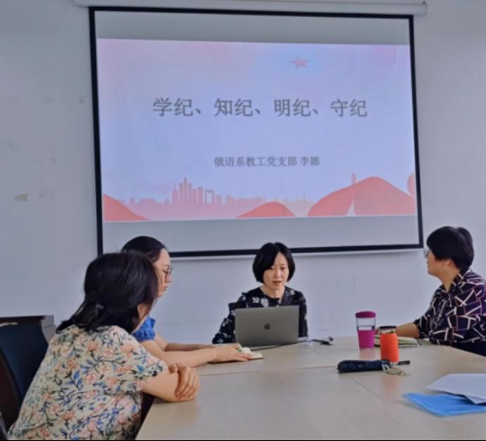俄语系教工党支部在鄠邑校区崇文楼314会议室开展党纪学习教育,俄语系教工党支部全体党员参加活动。