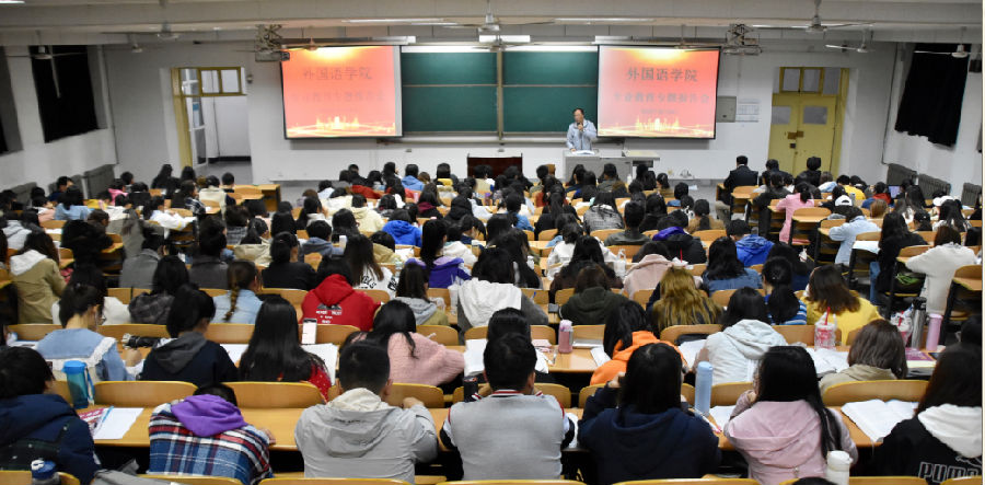 专业教育专题报告会在鄠邑校区A134教室召开,副院长陈武、英语系主任钟泽波、俄语系主任李娜和翻译系主任高鹏鹏、学管办主任张帆参加。报告会由学管办主任张帆主持,学院2018级及2019级300余名学生参加听取本次专题报告会。