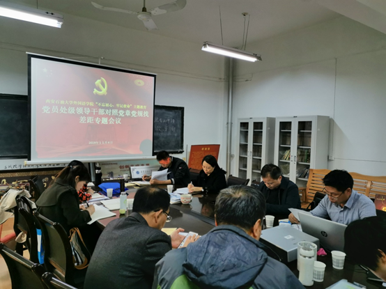 在党员处级干部对照党章党规找差距专题环节,学院党委书记蔡强、党委副书记王业青、副院长刘辉、副院长陈武先后结合个人岗位工作及履职担当情况,按照学校“不忘初心、牢记使命”主题教育领导小组《关于在“不忘初心、牢记使命”主题教育中做好对照党章党规找差距的通知》的要求,严格对照党章、《准则》、《条例》和《中国共产党工作机关条例(试行)》,逐条进行了自我检视找差距,明确自身不足与整改方向,并就个人对照检查的整改台账、整改措施与参会同志进行了讨论交流。