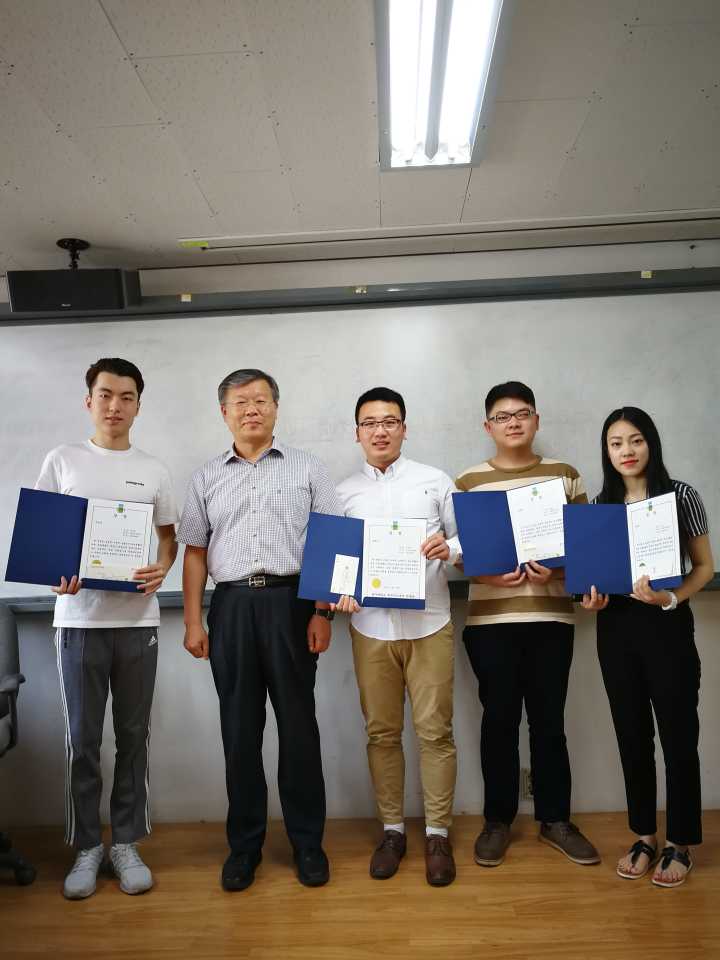 2014级赴韩国光州大学的4名交换郭子煜、陈永辉、张雨、岳浩浩荣获光州大学韩国语教育系“模范生”奖状。