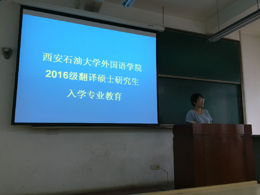 院学术委员会主任袁森教授用流利的英文从师资队伍、学科建设、专业建设、科学研究、办学条件等方面的具体向大家介绍了我院翻译硕士授权点的情况,为他们更好地融入研究生学习生活奠定了基础。在户县校区领导新生军训工作的院党委书记廖敏也专程赶回来参加了本届翻译硕士开学典礼。(院办)