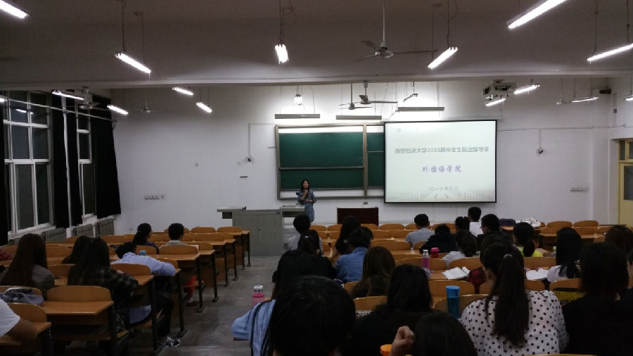 9月19日晚,院党委书记廖敏在户县B325教室,为全体毕业生讲授了一堂生动、实用的就业指导课。 廖敏书记从2017年就业形势、外语专业本科毕业生面临的困难与机遇、就业的基本程序、技巧、就业的心态、正确的就业观等诸多方面帮助毕业生进行了分析讲解。她用具体的事例和详尽的数据鼓励广大毕业生认清形势,树立信心,准确定位,把就业作为自立自强的生活尊严,积极主动投身到就业工作中去。
