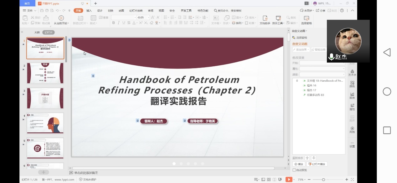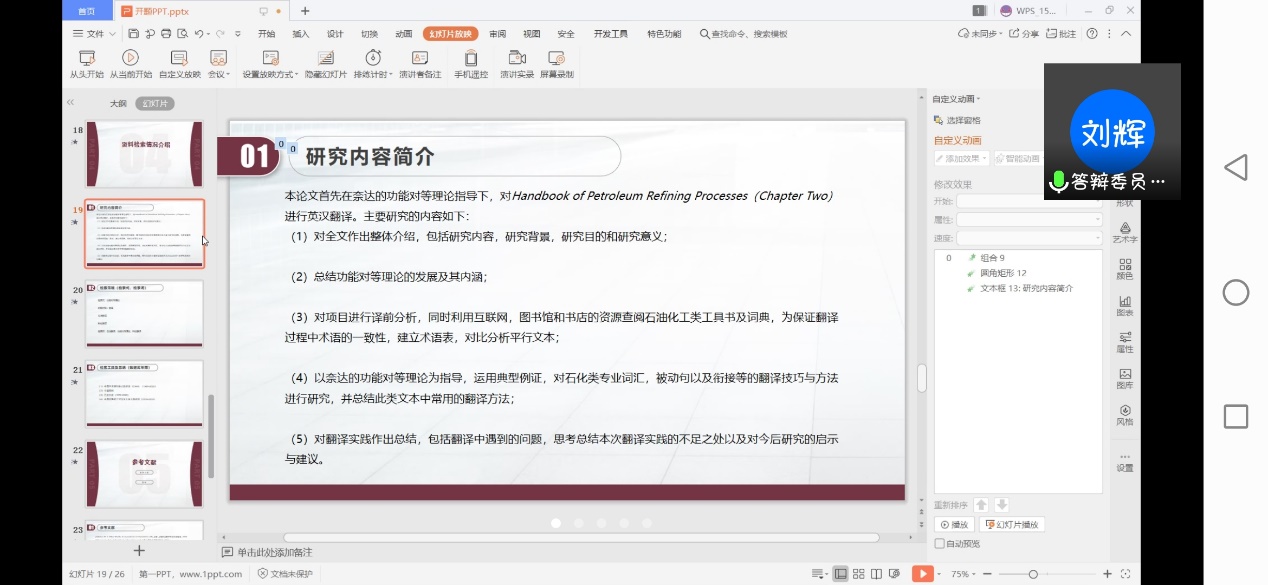 依据研究生院《硕士学位论文开题管理补充规定》制定了2018级翻译硕士研究生二次开题工作细则,并于4月3日上午,使用线上平台(腾讯会议)进行了2018级翻译硕士研究生二次开题答辩会。答辩小组包括组长袁森教授,答辩委员刘辉教授和秦艳霞副教授,共有9名翻译硕士研究生参加答辩。