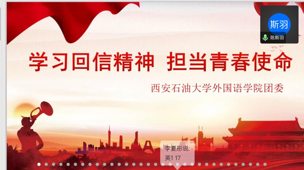 的团员同学用“云端相聚”方式一起完成了特殊的主题团日活动,本次“双语学”主题团日活动融合了自身专业,契合了时代背景。希望同学们牢记习近平总书记对青年学生的希望和要求,正确面对疫情,牢记责任使命,按照党中央、教育部的要求,认真做好网络教学课堂学习,坚决做到“停课不停学”;希望学院团委在服务好第一课堂专业学习的同时,积极利用QQ、微信公众号等网络平台,结合学院专业开展特色鲜明的第二课堂学习活动,丰富同学们精神文化生活,提升学生综合素质水平;希望同学们将习近平总书记的回信精神溶于血液中,在青春奋斗中践行使命,写好自己的青春故事,培育爱国情怀和树立报国之志,锤炼过硬本领,做有知识、有能力、有高度社会责任感的新时代青年。