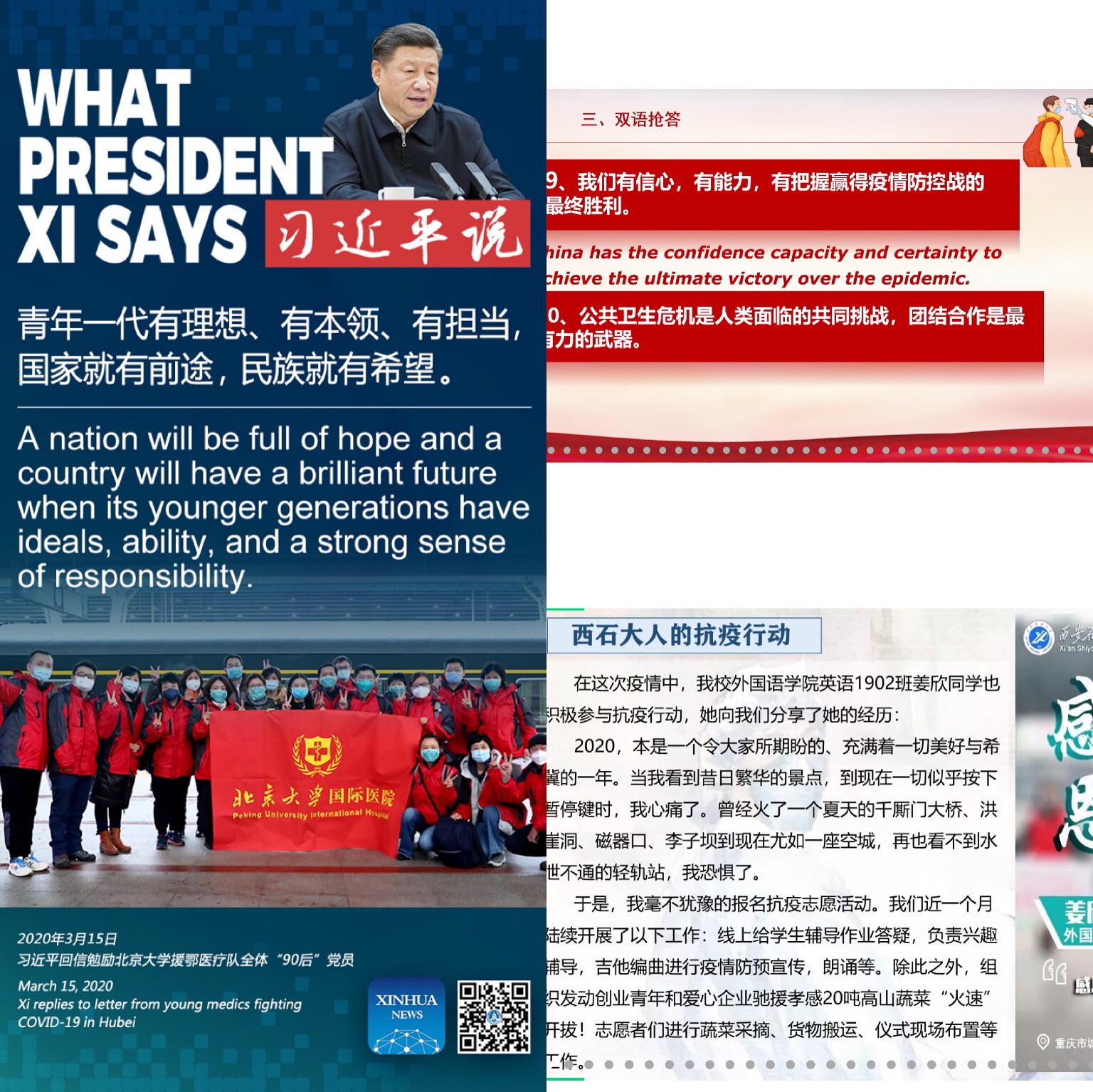 翻译1901邓雨昕同学也表示:“Through this activity,we have harvested a lot of classic quotations about President Xi, and also strengthened our confidence in the fight against the epidemic. I believe that all of us can return to campus and start normal study life in the future.”