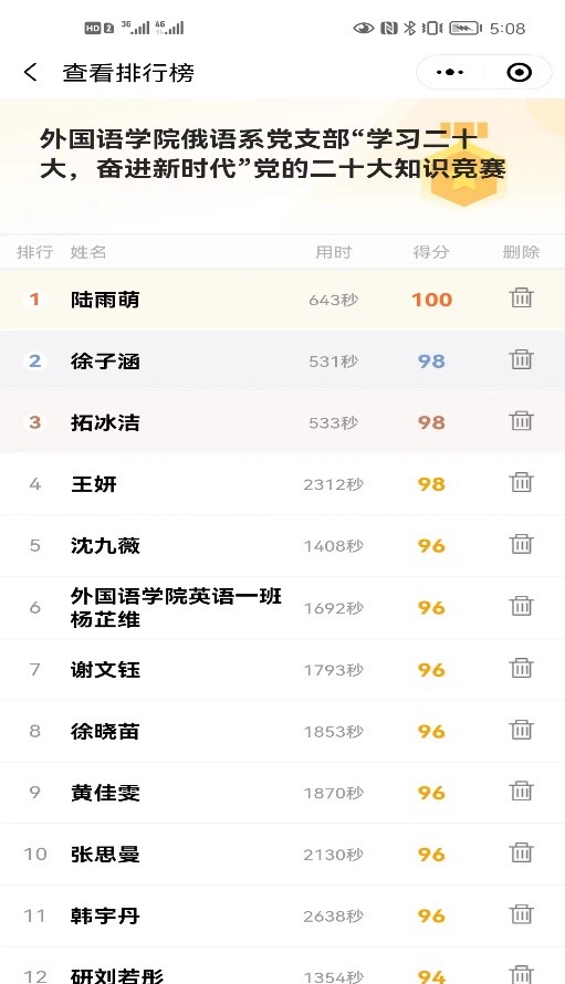 知识竞赛内容包括党的二十大精神、毛泽东思想和中国特色社会主义概论、中国近代史纲要和习近平总书记系列讲话四部分,共50题,满分为100分。最终根据参与人数比例,产生一等奖一名、二等奖1名、三等奖2名、优秀奖3名。