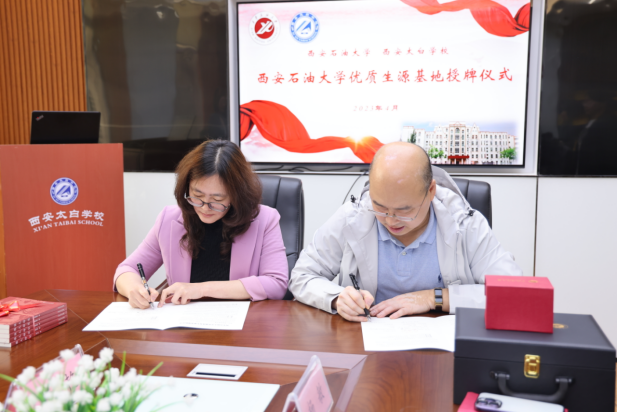 党委书记田虹霞、副院长陈武一行5人前往西安太白学校举行“优秀生源基地”授牌仪式。西安太白学校校长柴文华、常务副校长尹克红、教导处主任周楠、校办副主任杨敏参加授牌仪式。