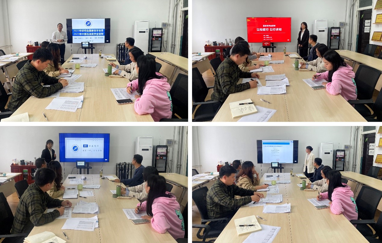 在雁塔校区华油能源楼727会议室召开2023年研究生国家奖学金和中国石油奖学金答辩评审会,院党委副书记王业青、副院长陈武、研究生导师代表秦艳霞、学工办主任周宇、研究生辅导员张靓以及研究生代表参加会议。会议由院党委书记田虹霞主持。