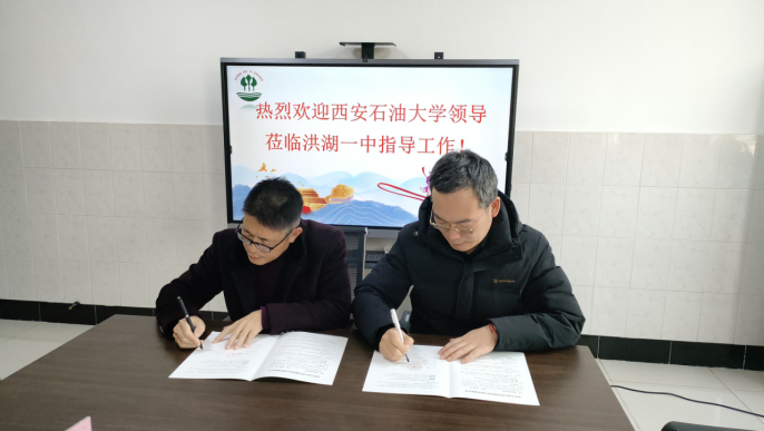 在洪湖市,学校一行与洪湖市第一中学副校长戴裕明等领导进行座谈。双方介绍了各自的办学历史、办学规模、办学特色,并就继续开展更为深入的合作进行深入交流。张建高代表学校与洪湖市第一中学领导共同签署《汗汗漫画