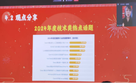 在随后的互动环节,崔启亮教授分享了“2024年热点话题统计—政策行业类数据”,分析了政策与行业在人工智能领域的最新发展。西安外国语大学高级翻译学院副院长赵毅慧围绕“2024年度技术热点话题及2025年度趋势预测统计”进行了分析,预测了未来语言服务领域的技术趋势。