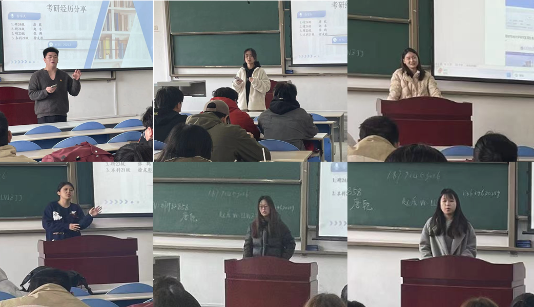 活动中,本科21级徐友彤、本科21级石晶晶、研24级李玟、研24级唐乾、研24级赵乐、研23级张鹤等6名优秀学生分享了各自考研深造的原因、经历以及备考过程心得感悟。他们结合自身经验分别从目标学校选择,到政治、专业课的学习等多个环节为大三学生答疑解惑。参会学生纷纷表示,学长学姐的“干货”分享使大家对考研深造有了清晰的认识,学长学姐们勤奋刻苦、学有所成为大家树立了很好的榜样。