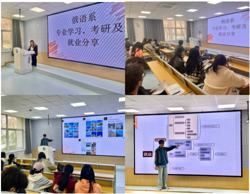 在博览楼A110举办学工讲坛第11期“俄语专业学生成长规划”主题活动。活动由俄语系主任张艳老师主持,特邀董鑫、马卓瑶等优秀在校生代表,以及在俄留学交换生薛思琪、樊静、余满通过线上线下联动方式开展交流。21级、22级、23级近百名俄语专业学生参加活动。