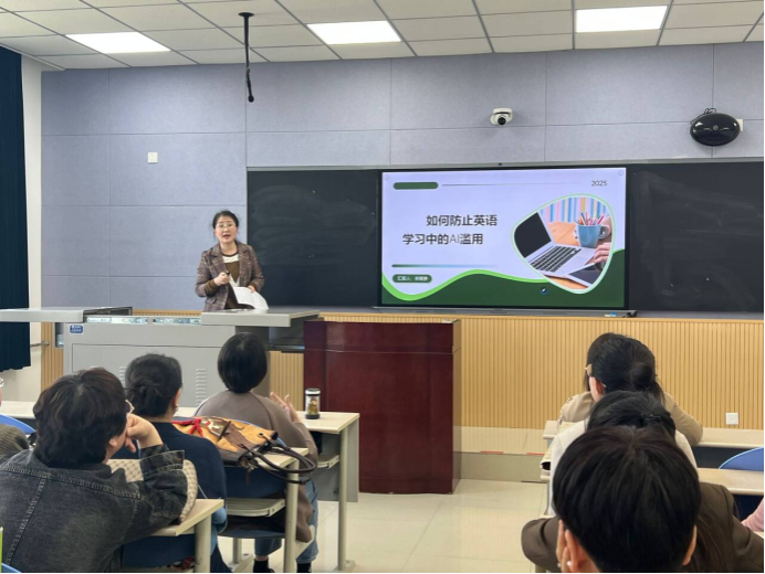 支部组织委员胡媛静老师结合自己实际教学经验提出“AI双刃剑”应对策略。她向大家详细讲解了AI时代如何防止英语学习中的AI滥用,并指出随着AI技术的发展,是机遇也是挑战,教师需创新数字化教学工具,提升教育效率与公平性。
