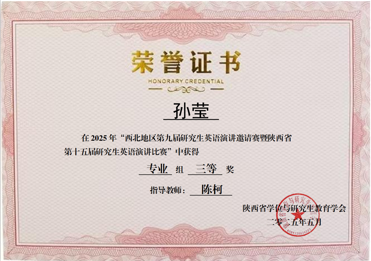 2023级硕士研究生孙莹在陈柯、张虹老师的指导下荣获英语专业组三等奖,人文学院2024级研究生唐晨阳在张虹、李涛老师的指导下荣获非英语专业组三等奖。